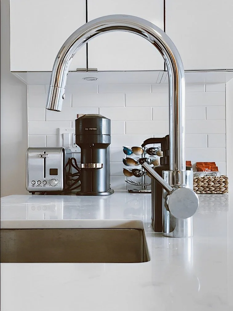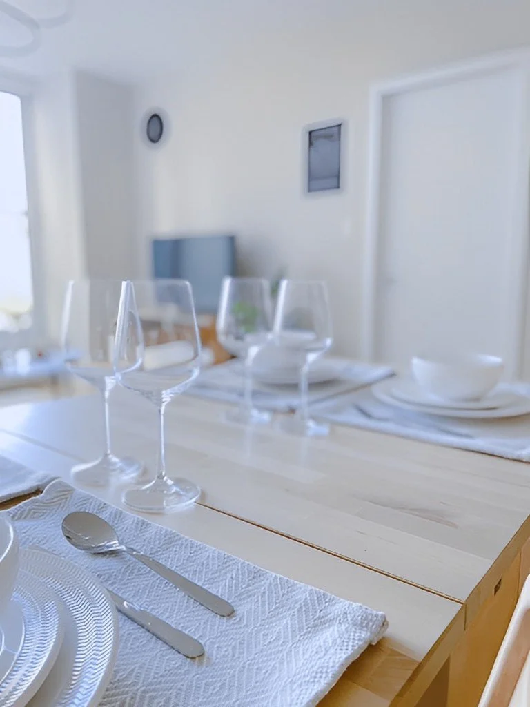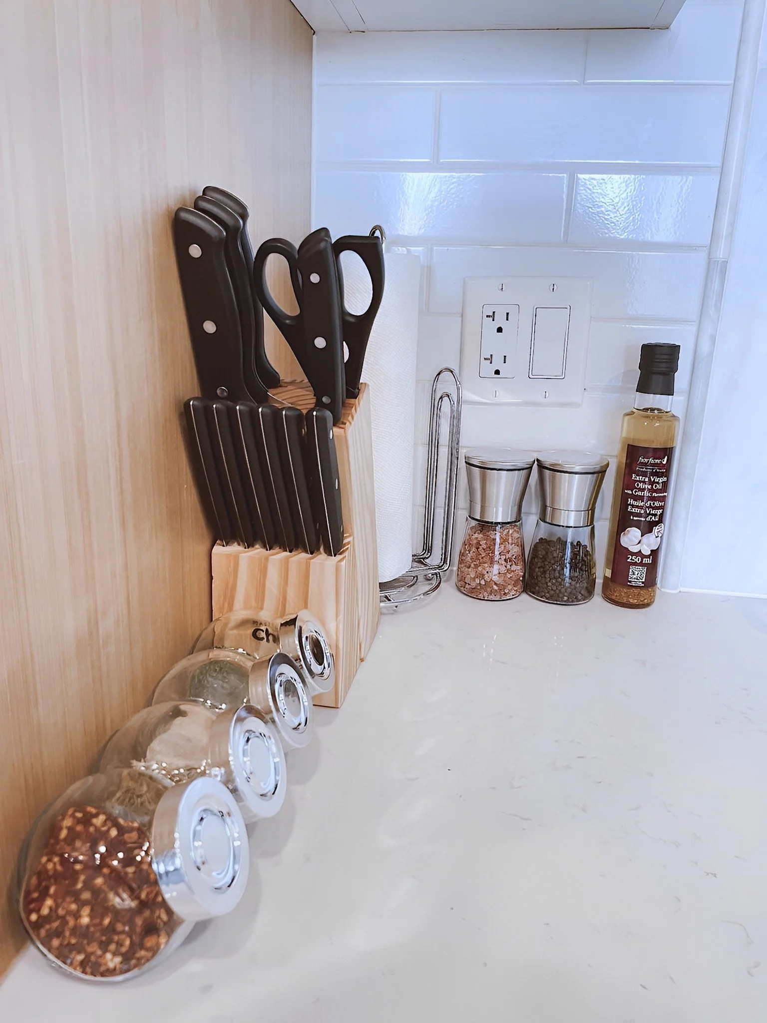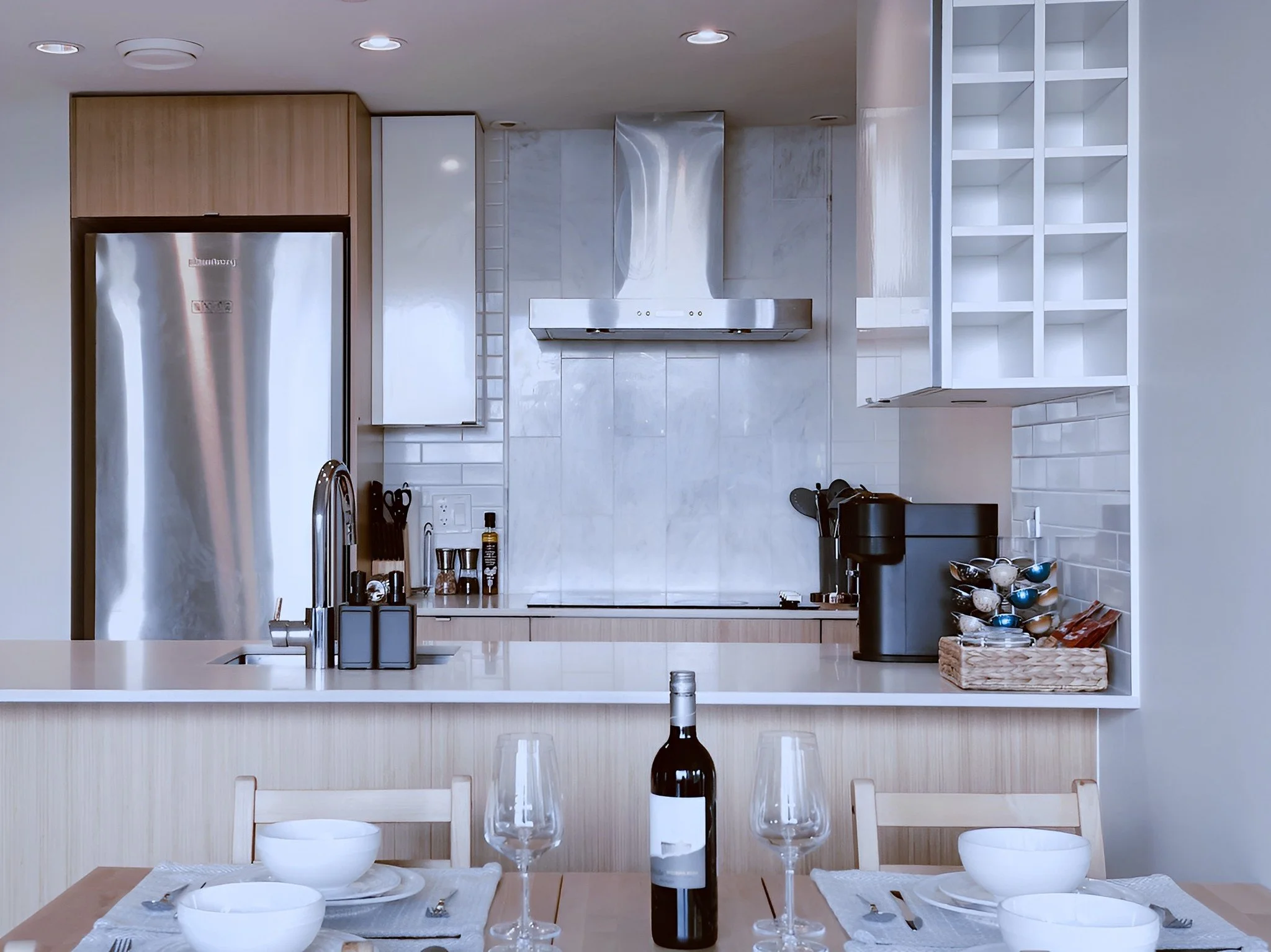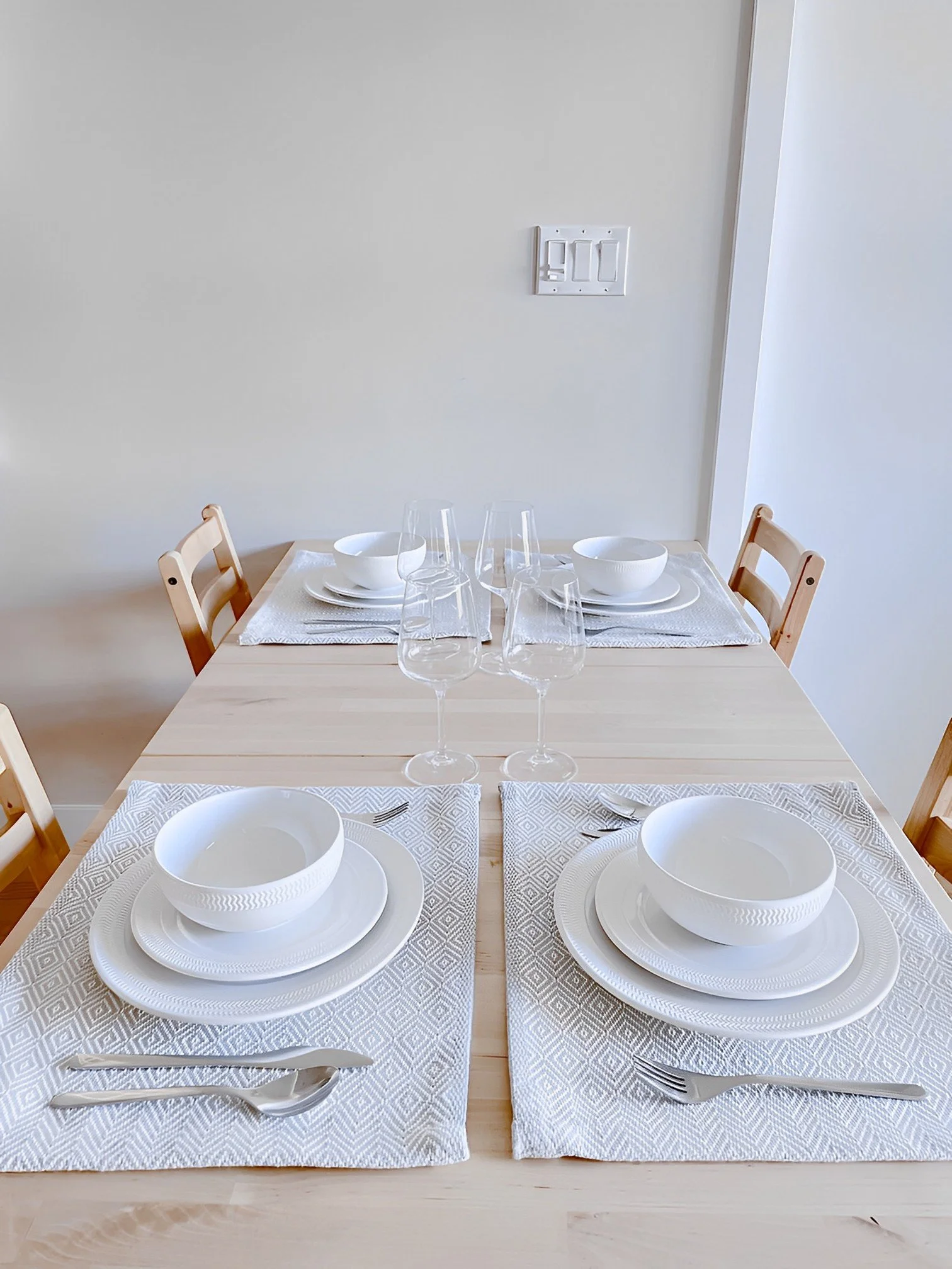 Our kitchen is equally impressive as it contains the basics – a microwave, fridge, stove, oven, dishwasher, toaster, blender, rice cooker, enough cabinets and drawers to store silverware, dishes, pots and pans, cooking utensils, cups, wine glasses, etc.