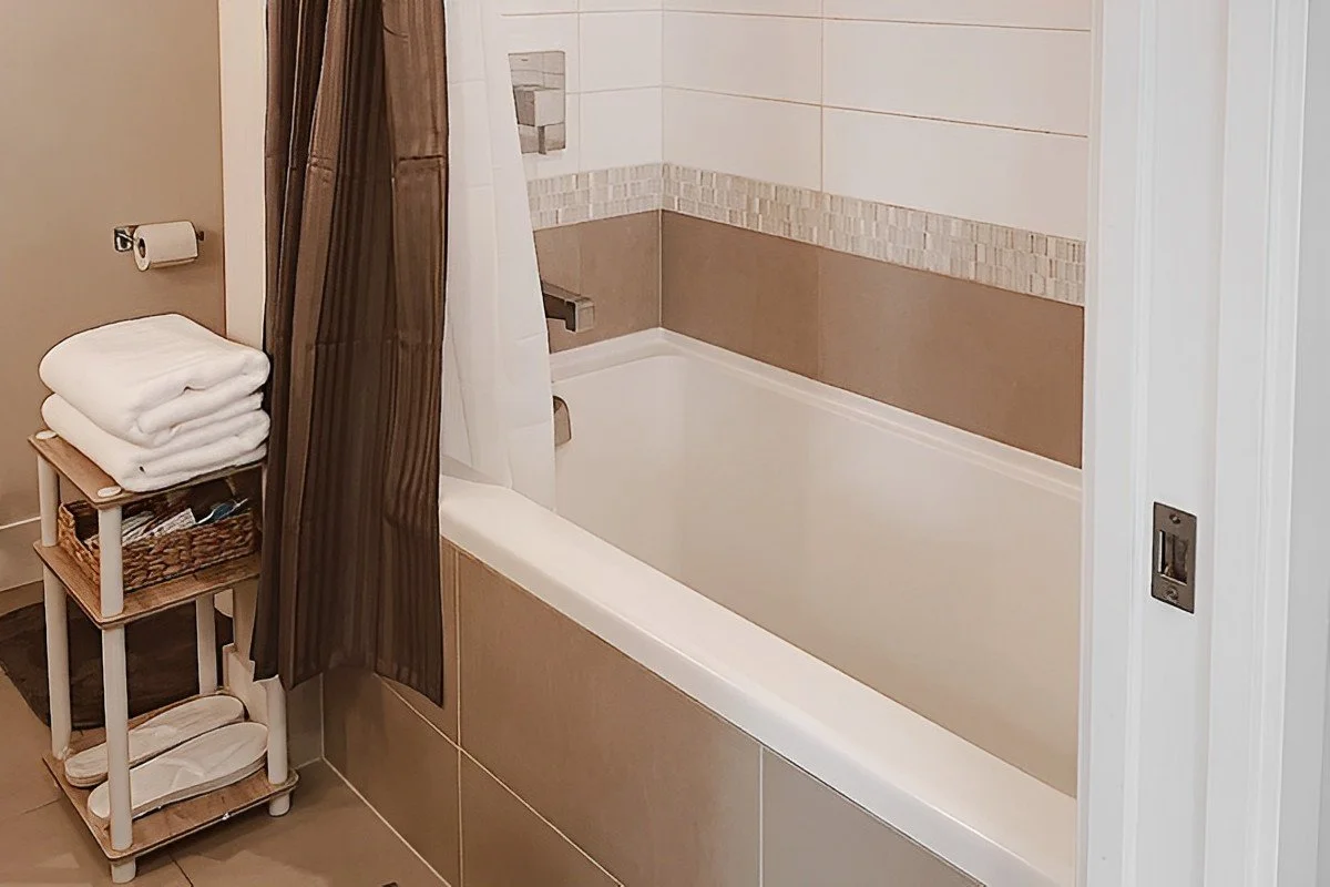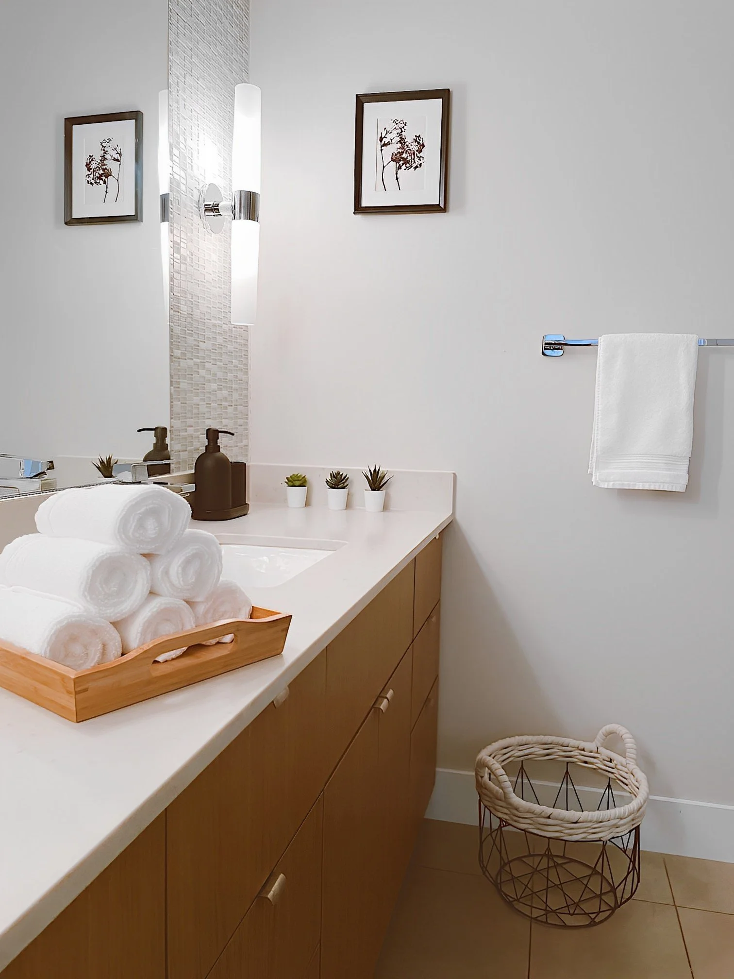 The bathroom houses a full bathtub, two sinks, a toilet and fully equipped with a variety of essentials (quantity varies based on guest count) such as a hairdryer, enough face, hand, body towels for a large group, a first aid kit, disposable slippers, toothbrushes, toothpaste, mouthwash, shampoo, conditioner, body wash, body lotion, shavers, shaving cream, feminine products, lint roller, floss, cotton balls, cotton pads, cotton buds, etc.