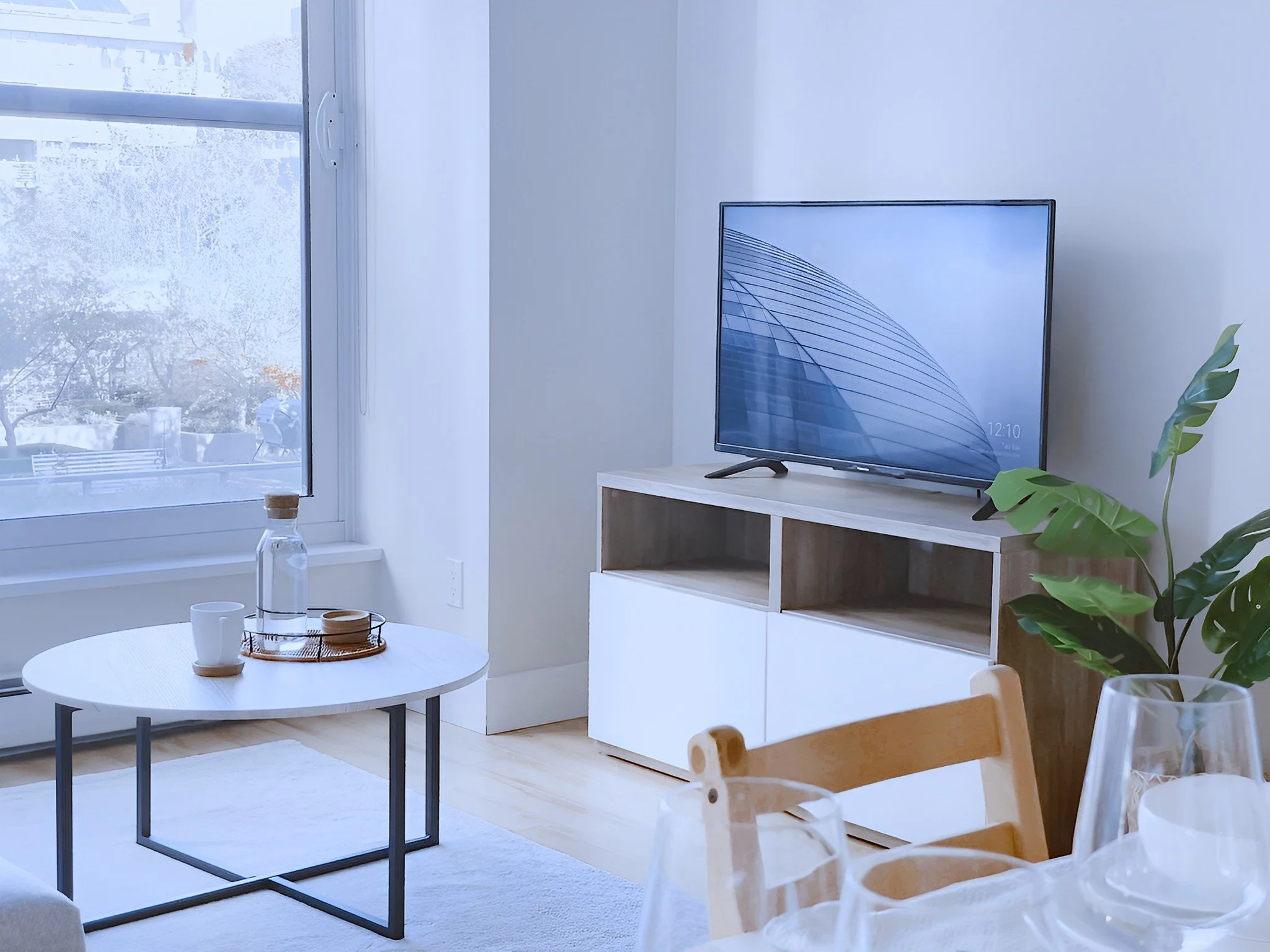 Our living area is simple – a sofa, coffee table, a smart TV and a large north-facing window; perfect for a group of friends or family to gather round and spend quality time.